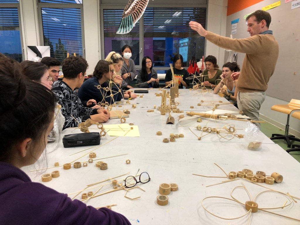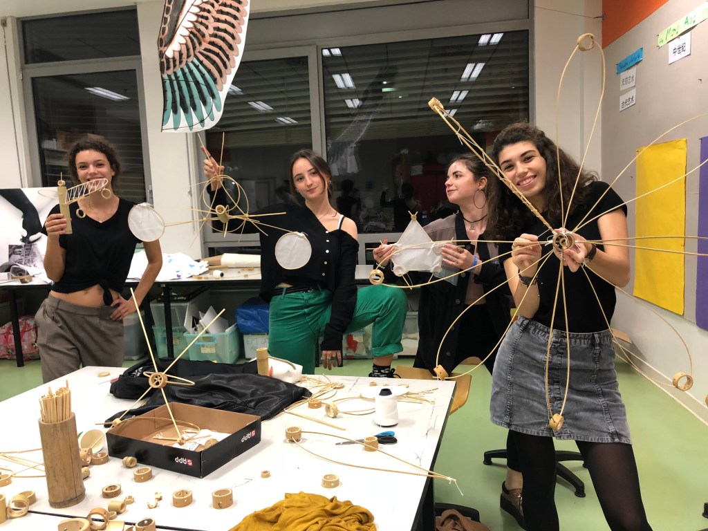 Nous avons invité l’artiste américain George Kay, installé à Shanghai depuis plusieurs années. Il est spécialisé dans le détournement des techniques traditionnelles chinoises plus précisément les matériaux de confection des cerf-volant. À partir des expérimentations autour de l’air et de l’eau et à l’aide des techniques apprises auprès de l’artiste George Kay, les élèves créent une sculpture mobile qui représente le vent ou l’idée du mouvement de l’air.