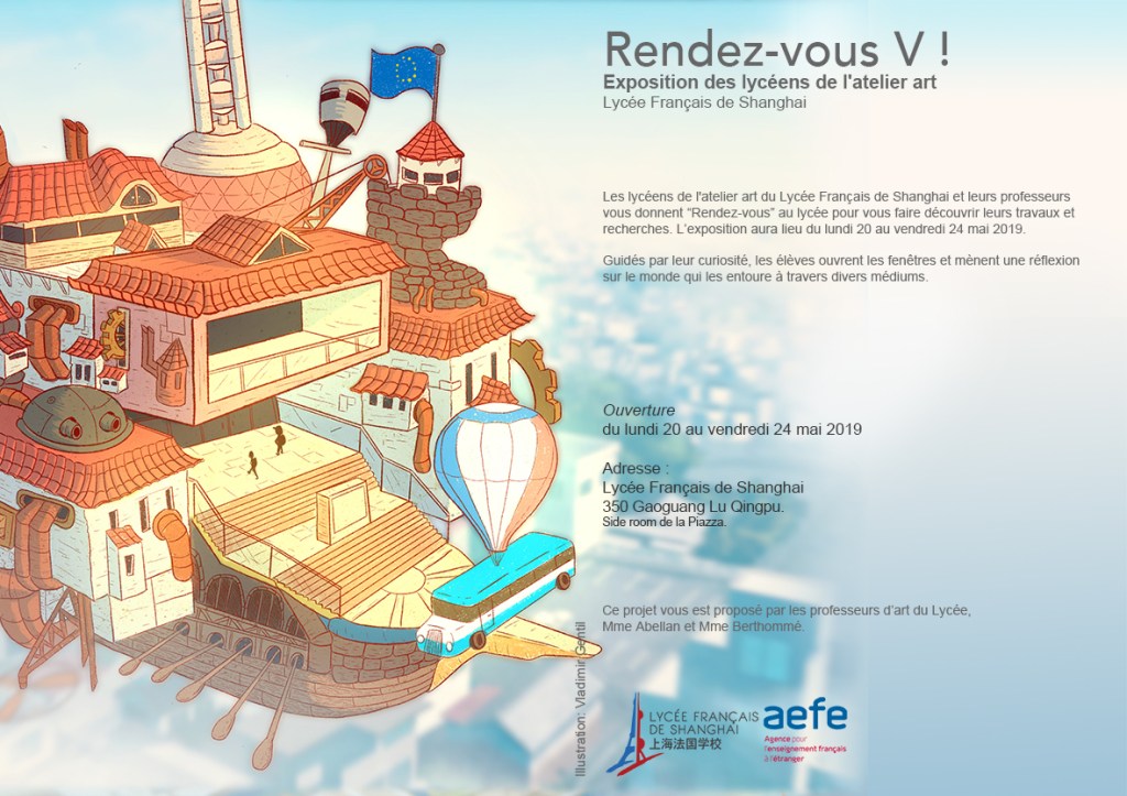 Les lycéens de l’atelier art du Lycée Français de Shanghai et leurs professeurs vous donnent “Rendez-vous” au lycée pour vous faire découvrir leurs travaux et recherches. L’exposition aura lieu du lundi 20 au vendredi 24 mai 2019.